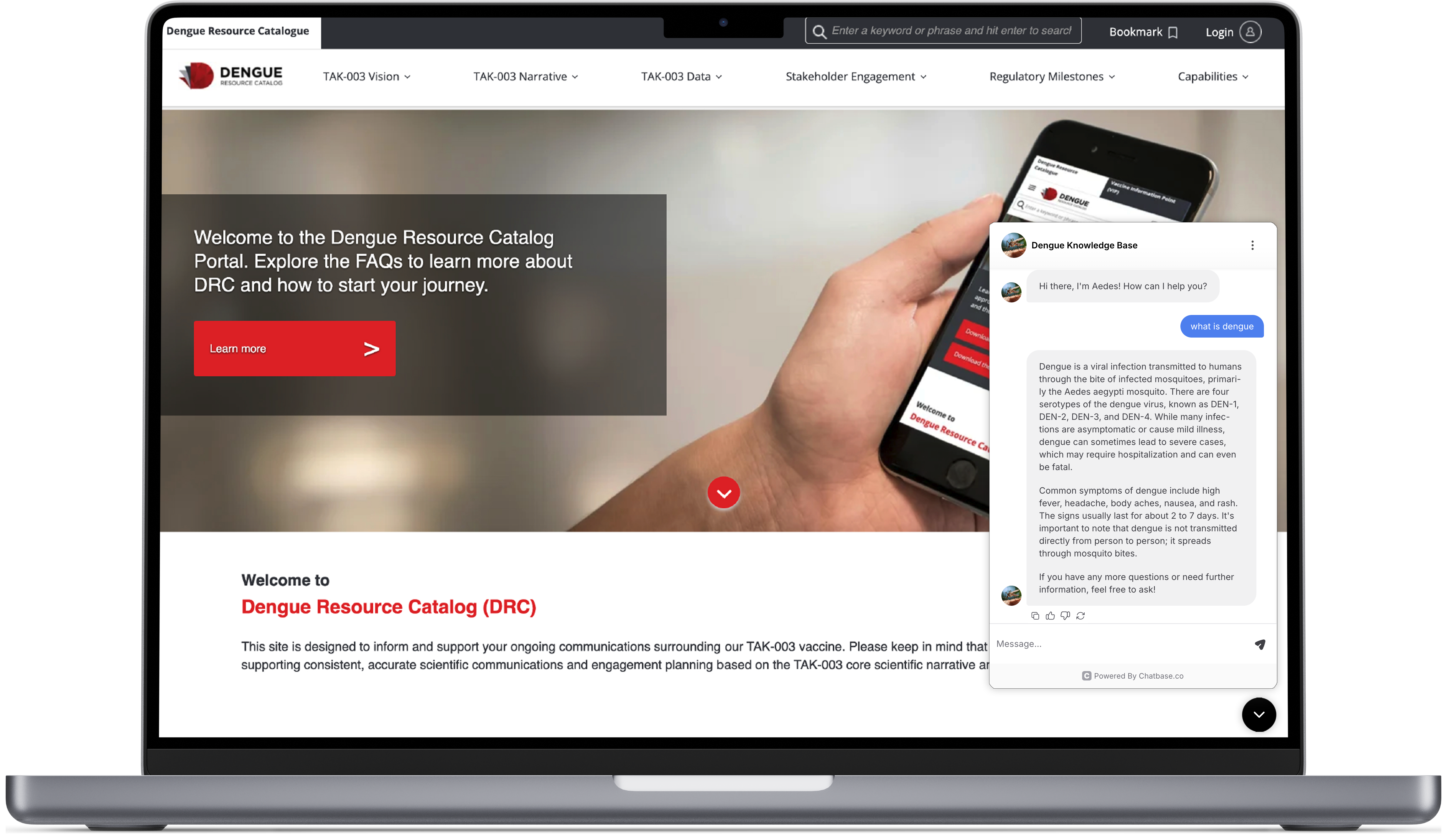 The Dengue Knowledge Hub CAIcchatbot can deliver significant value by transforming how patients, healthcare professionals (HCPs), and internal teams access dengue-related information by providing 24/7 access. This will dramatically reduce the time spend searching through databases and other platforms for the required documentation and information. Internal teams will have streamlined access to evidence-based resources, current clinical guidelines, and latest research developments, enabling more informed decision-making during patient care and treatment protocols. The chatbot's ability to be fully integrated with existing platforms within the digital ecosystem of Takeda can create an improved user experience.