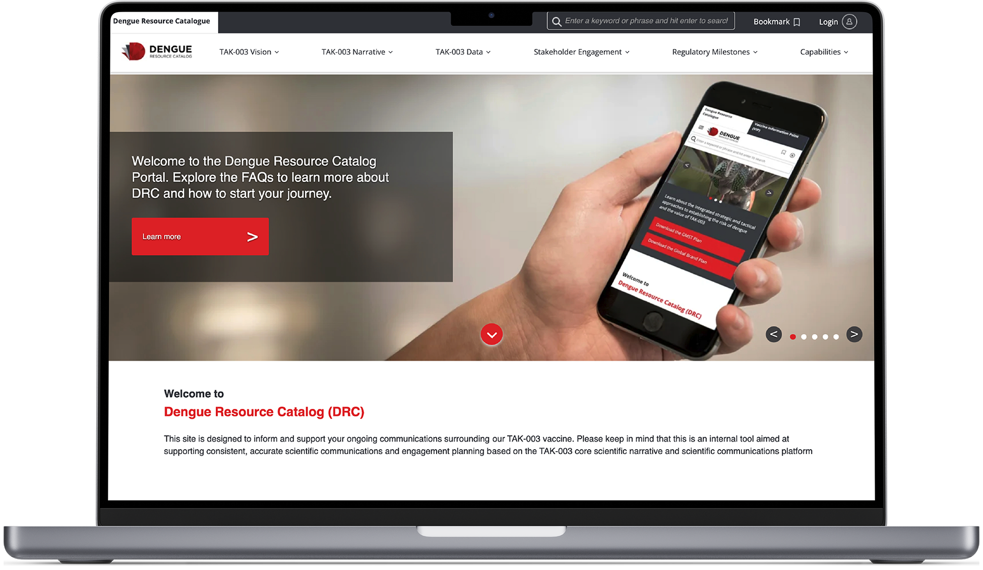 The Dengue Resource Catalog (DRC) platform became a cornerstone of Takeda’s digital ecosystem. The platform received positive feedback for its usability and comprehensive content about our dengue vaccine candidate (TAK-003). This project demonstrated my ability to lead complex digital initiatives, collaborate across diverse teams, and deliver impactful solutions that align with both user needs and organizational goals.