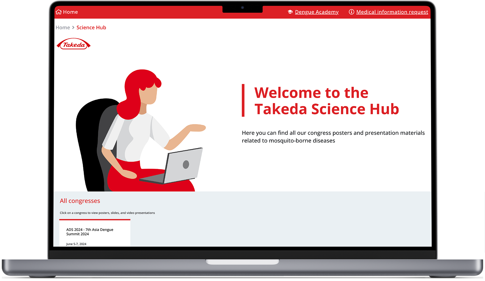 The Vaccine Science Hub (vaccinesciencehub.com/science-hub) is a digital platform developed for the Vaccine Business Unit at Takeda, with a specific focus on supporting endorsed congresses. It serves as a central platform for the dissemination of approved posters and presentation materials related to dengue. This platform aims to enhance the reach and impact of scientific findings presented at these congresses, making valuable information more accessible to healthcare professionals (HCPs).